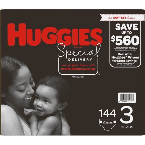 The softest diaper. Save up to $560 (Based on expected lifetime diaper usage; Mega Colossal Plus Pack MSRP vs. Jumbo Pack MSRP. Actual pricing is at the discretion of the retailer). Pair with Huggies Wipes for extra savings (Based on suggested retail price of 640 ct. vs. 56 ct. Special Delivery Wipes). Our perfect diaper with plant-based (20%+ by weight) materials. 3-4 size; 18 months; 540 days (Weeks supply is based on average consumer usage); 2; 349 total diapers; $286.73 savings per size. Designs inspired by nature. Designs may vary. Fragrance free and clinically proven hypoallergenic. 100% breathable outer cover. Flexible leg cuffs help keep mess in. Huggies wetness indicator. how2recycle.info. huggies.com. 1-800-544-1847; Kimberly-Clark Corp. Dept. HDSD3-144 PO Box 2020 Neenah; WI 54957-2020 USA. Dispose of properly. Trusted performance with Responsibly Sourced Materials (Forest Stewardship Council (FSC) certified pulp). Made in the USA from domestic and imported material.